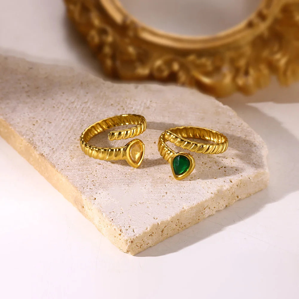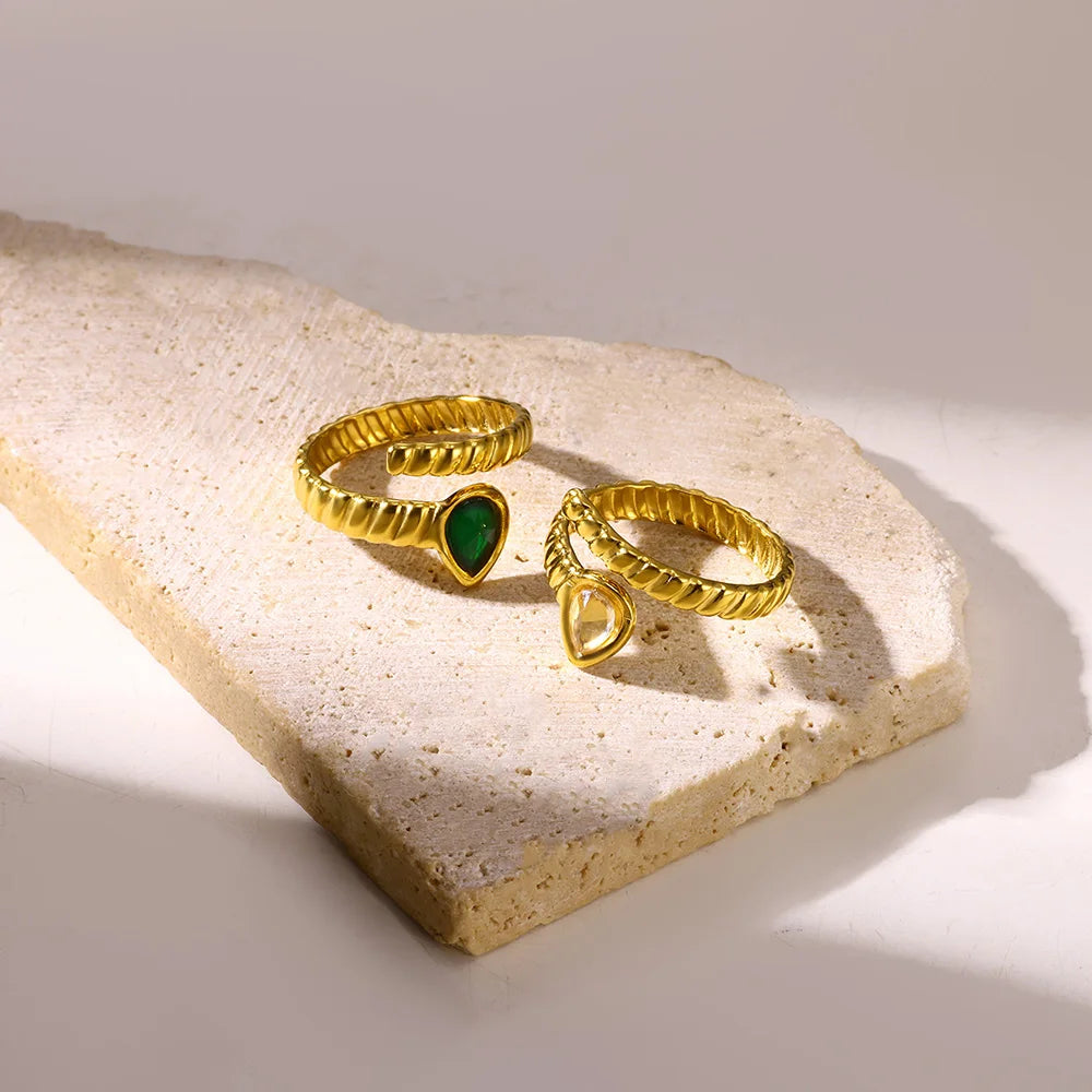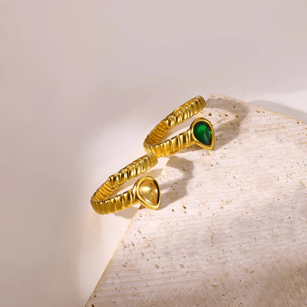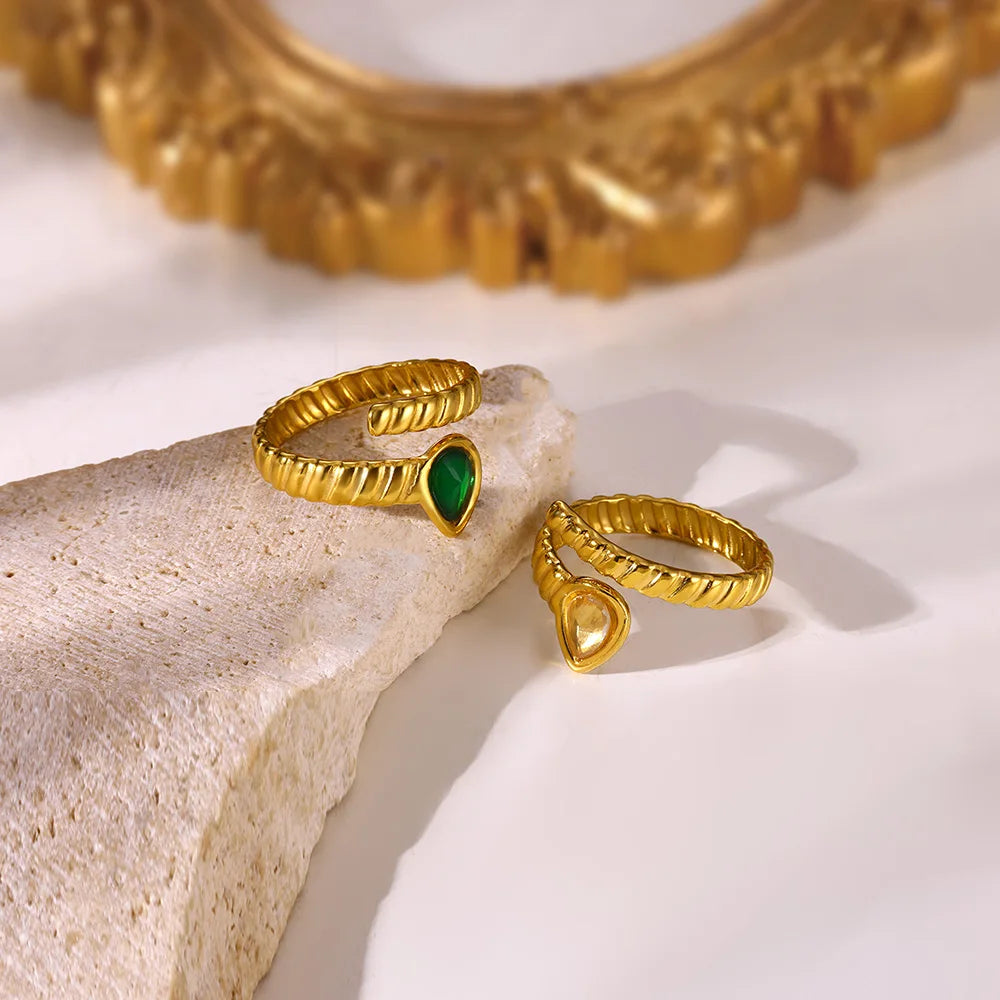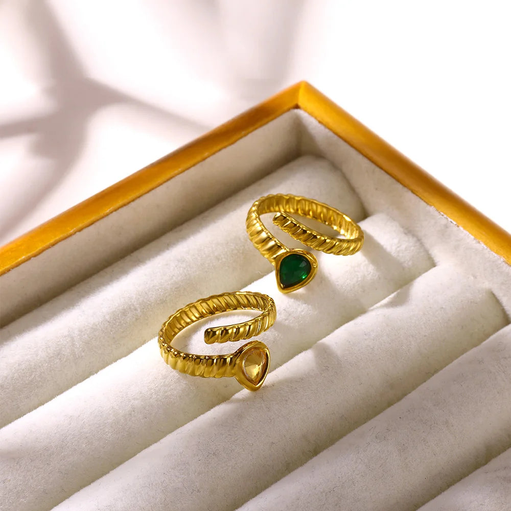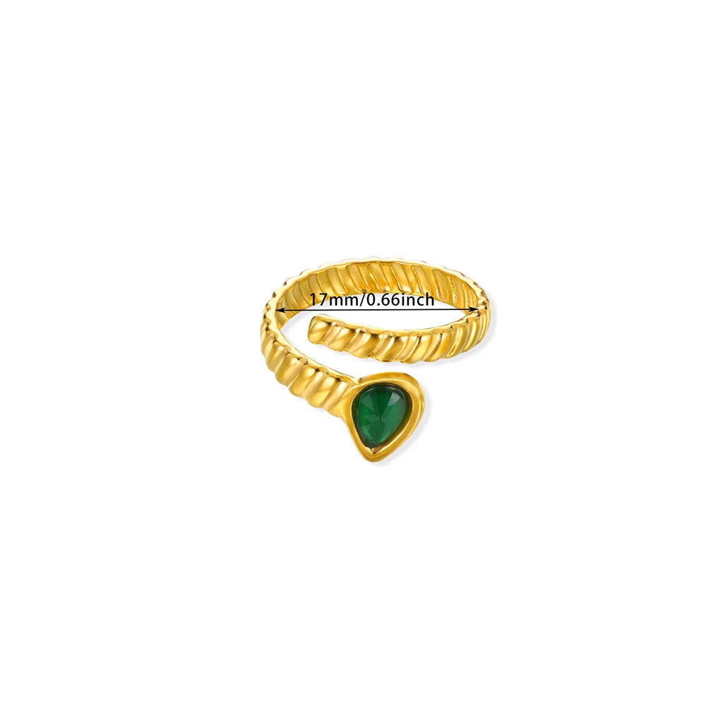 Stainless Steel Gold Color Open Rings For Women Green Zircon Water Drop Adjustable Ring Femme Wedding Party Fshion Jewelry Gift